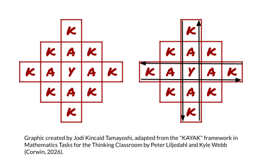 Next, Tyler gave the group the word kayak to work with. This task came from Mathematics Tasks for the Thinking Classroom, Grades 9–12 by Peter Liljedahl and Kyle Webb. The teachers had to determine how many times the word kayak could be formed using all of the letters in the word by connecting it—acrostic-style—to another kayak. (Additional Ks and As were added into the corners of the diagram.) Groups worked through the problem by discussing possibilities, laughing, questioning, erasing, and trying again. In the end, each group approached the task differently and explained their reasoning, with one group landing on the correct solution (I’m still not completely sure how they did it!).